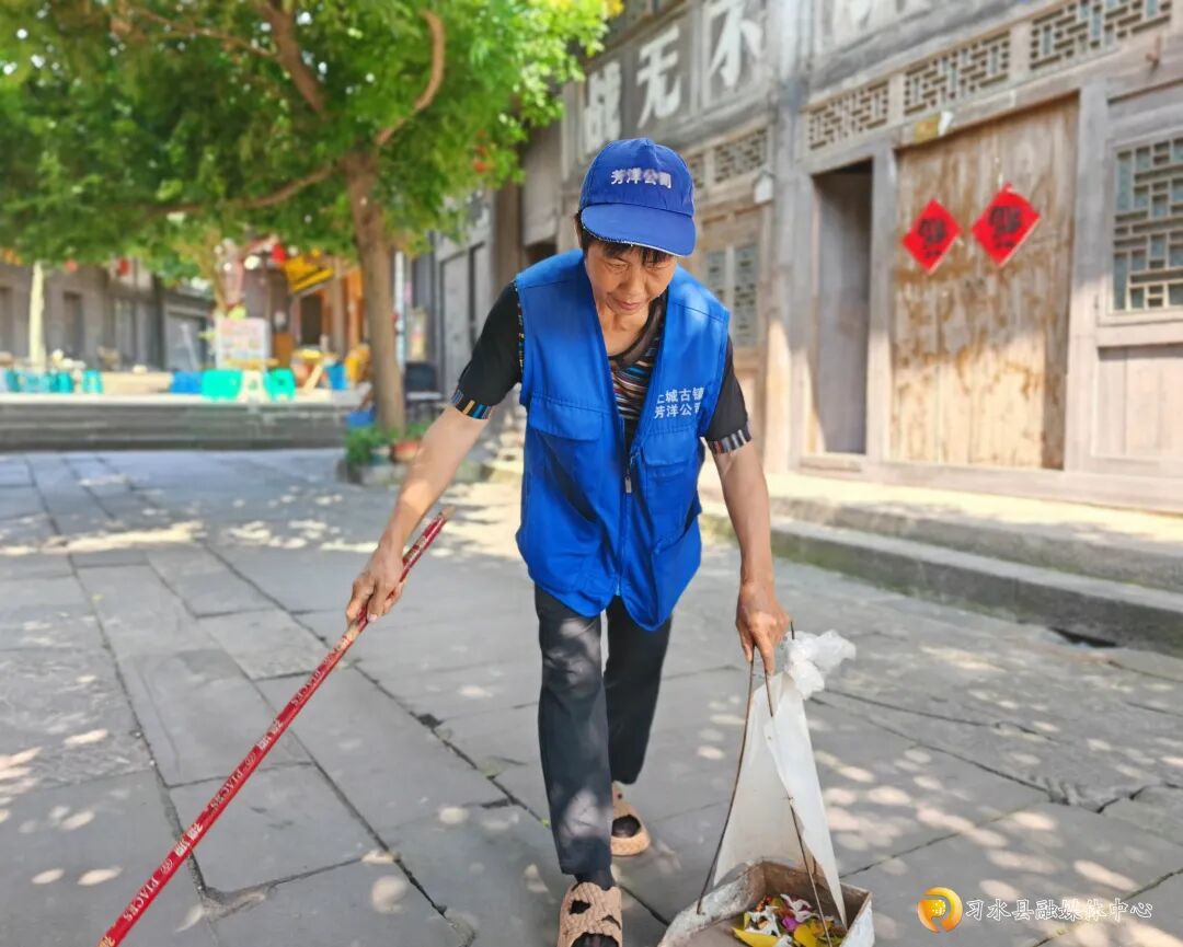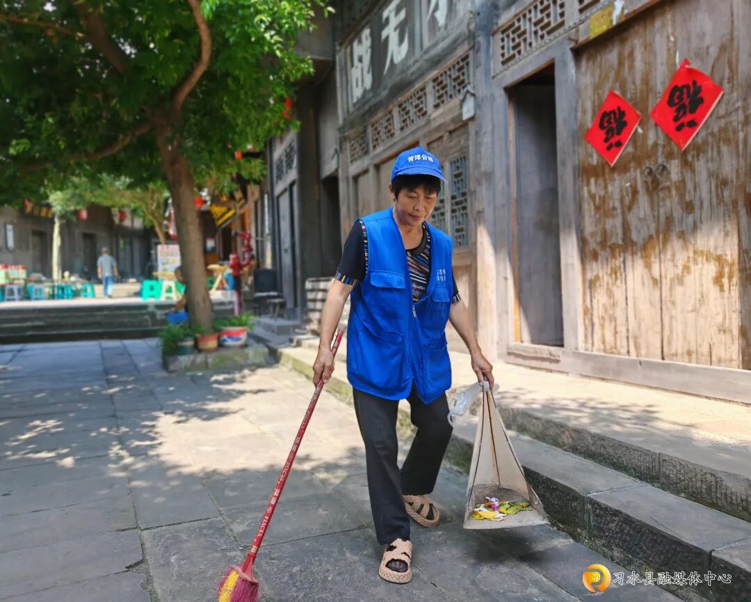 当暮色降临,刘玉贤和同事们会提着水桶,逐个擦拭景区的红灯笼和指示牌,绿色的身影在灯光下晃动,与沿街的国旗交相辉映。“看着干干净净的古镇,听着游客说‘这里真整洁’,就觉得所有累都值了。”