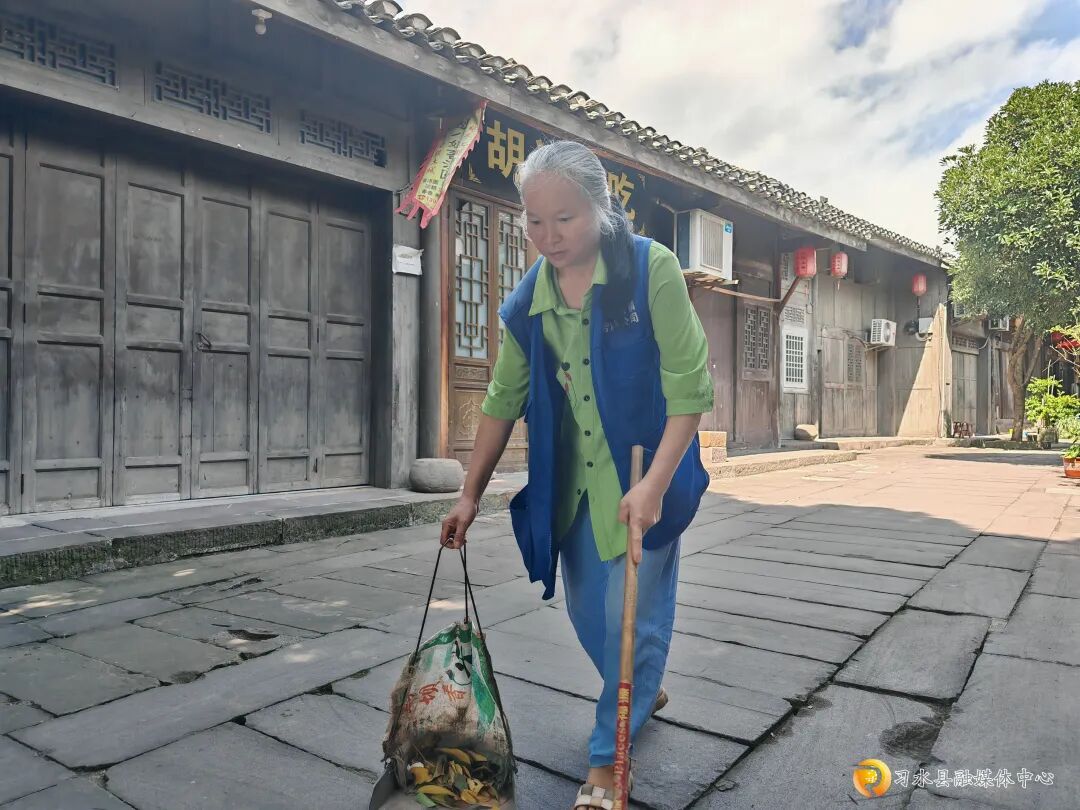 凌晨4点,古镇还没亮灯,就能听见环卫工人赵永香扫地的声音。赵永香负责的区域是古镇核心的“A区戏台至小桥流水段”,这条300米的石板路串联着名人故居、十八帮文化、小吃店等热门景点,上午,她刚清扫完路面,就看到一名游客不小心将奶茶洒在台阶上,怕行人滑倒,她立刻拿出随身带的抹布蹲在地上擦拭,直到污渍完全清除。“游客来玩图个开心,咱得让大家走得干净、逛得舒心。”赵永香笑着说,她的手套掌心早已磨出毛边,兜里还装着创可贴——这是她应对捡拾垃圾时被树枝划伤的“常备品”。