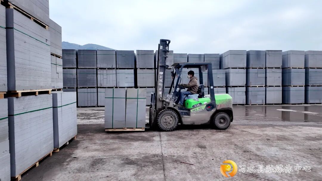 贵州鼎信新型建材有限公司工人王艺开着叉车归整产品。