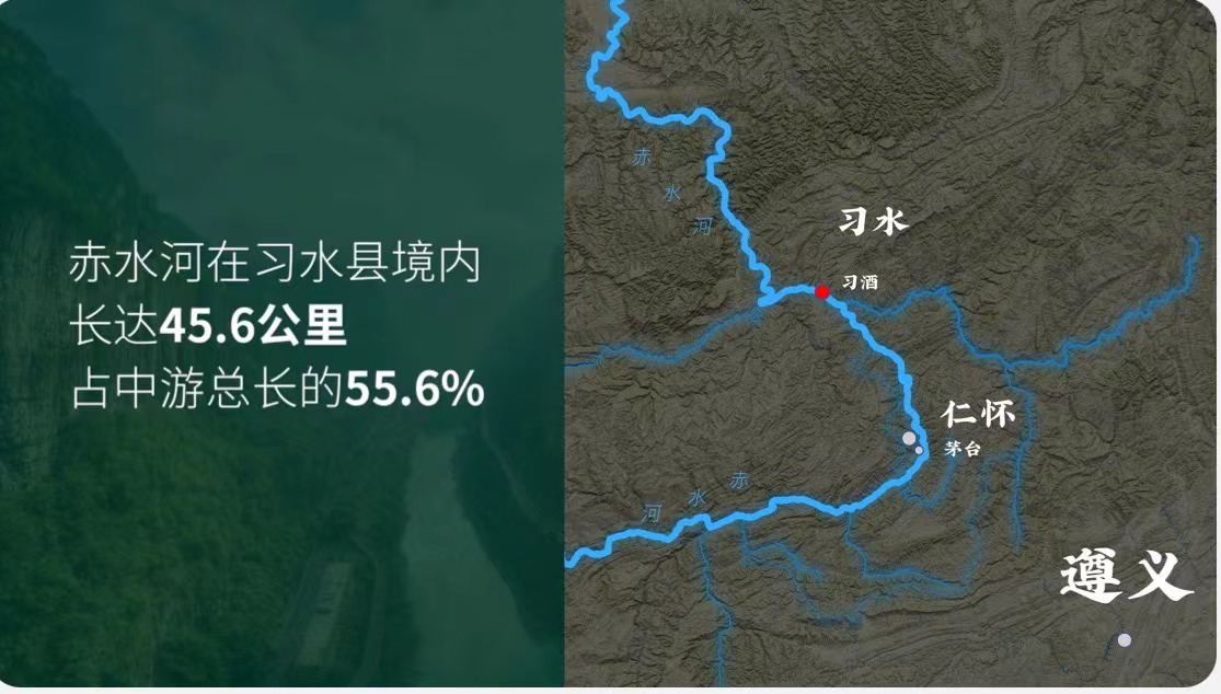 赤水河发源于云南镇雄,流经云、贵、川三省四市 16 个县(市、区)。从仁怀进习水,为中游腹地,孕育了举世闻名的茅台、习酒等多个酱香品牌,产值超 2000 亿元,是著名的美酒河。