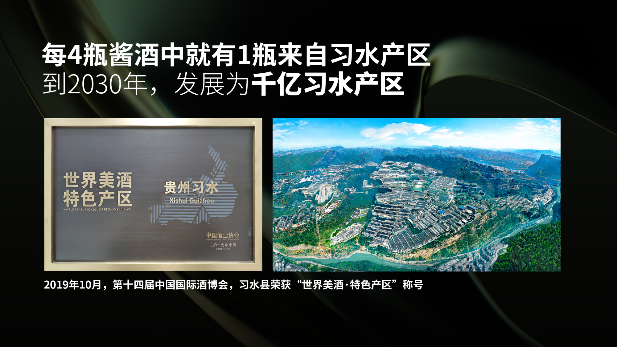 位于贵州北部的习水县,隶属红城遵义。向北融渝、往西接川,地处黔川渝结合部枢纽地带。作为贵州省为数不多的三高速县份,“2小时交通圈”覆盖三机场资源,纵贯南北、横跨东西的交通网络和物流体系已经成型。“集灵泉于一身,汇秀水而东下”的赤水河奔腾过境,孕育了赤水河流域酱香型白酒原产地和主产区的习水产区。2022 年,国务院印发《关于支持贵州在新时代西部大开发上闯新路的意见》,明确支持建设全国重要的白酒生产基地,习水产区已然成为“酱酒新高地”。下面,我将通过三个关键词,为大家介绍习水产区的基本情况。