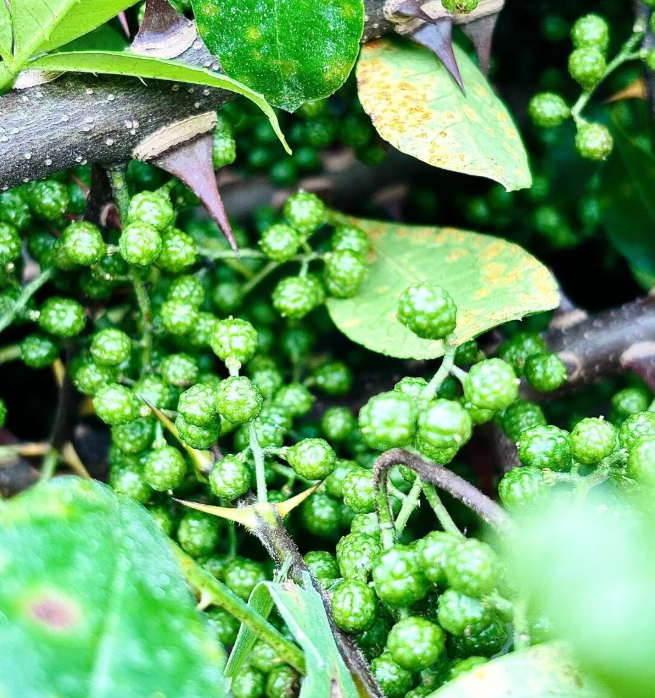 ▲花椒树的尖刺泛着油光。串串青果挨挤在刺丛里。(刁苓沙 摄)