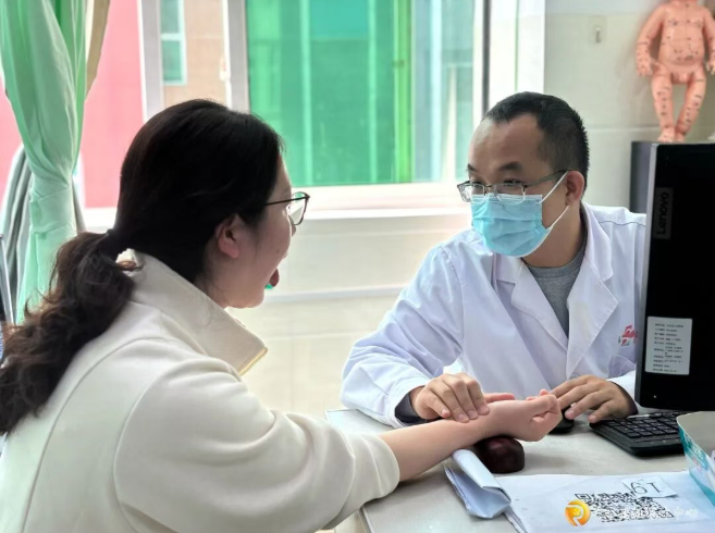 ▲诊室里,35岁的谢克航正握着患者的手腕把脉,观察舌象。(刁苓沙 摄)