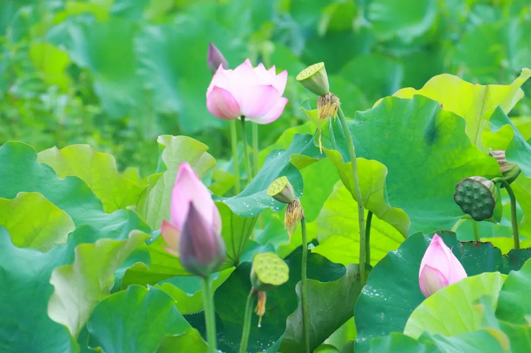 嫩黄的莲蓬藏在中央