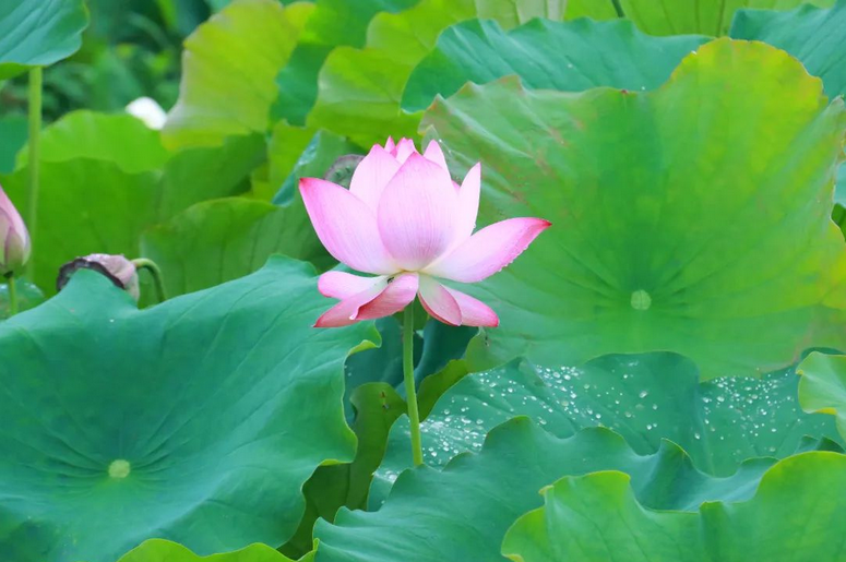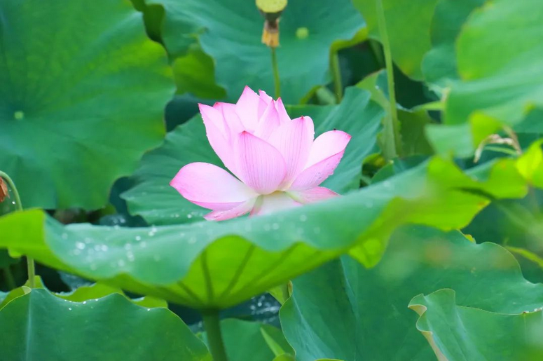 初绽的荷花半掩在叶间