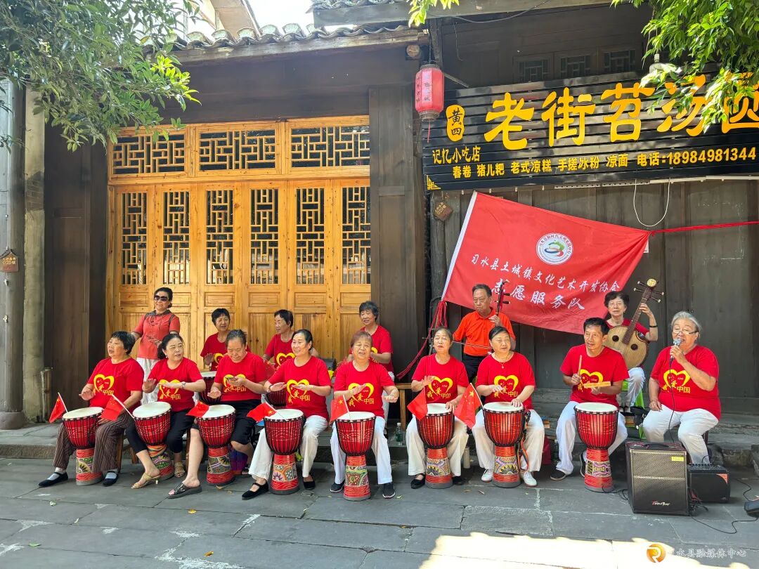 “咚嗒、咚嗒……”古镇A区入口附近,土城镇文化艺术开发协会志愿服务队的叔叔阿姨们,穿着印着“我爱中国”的红色文化衫,正合力敲着手鼓,节奏明快又热闹。