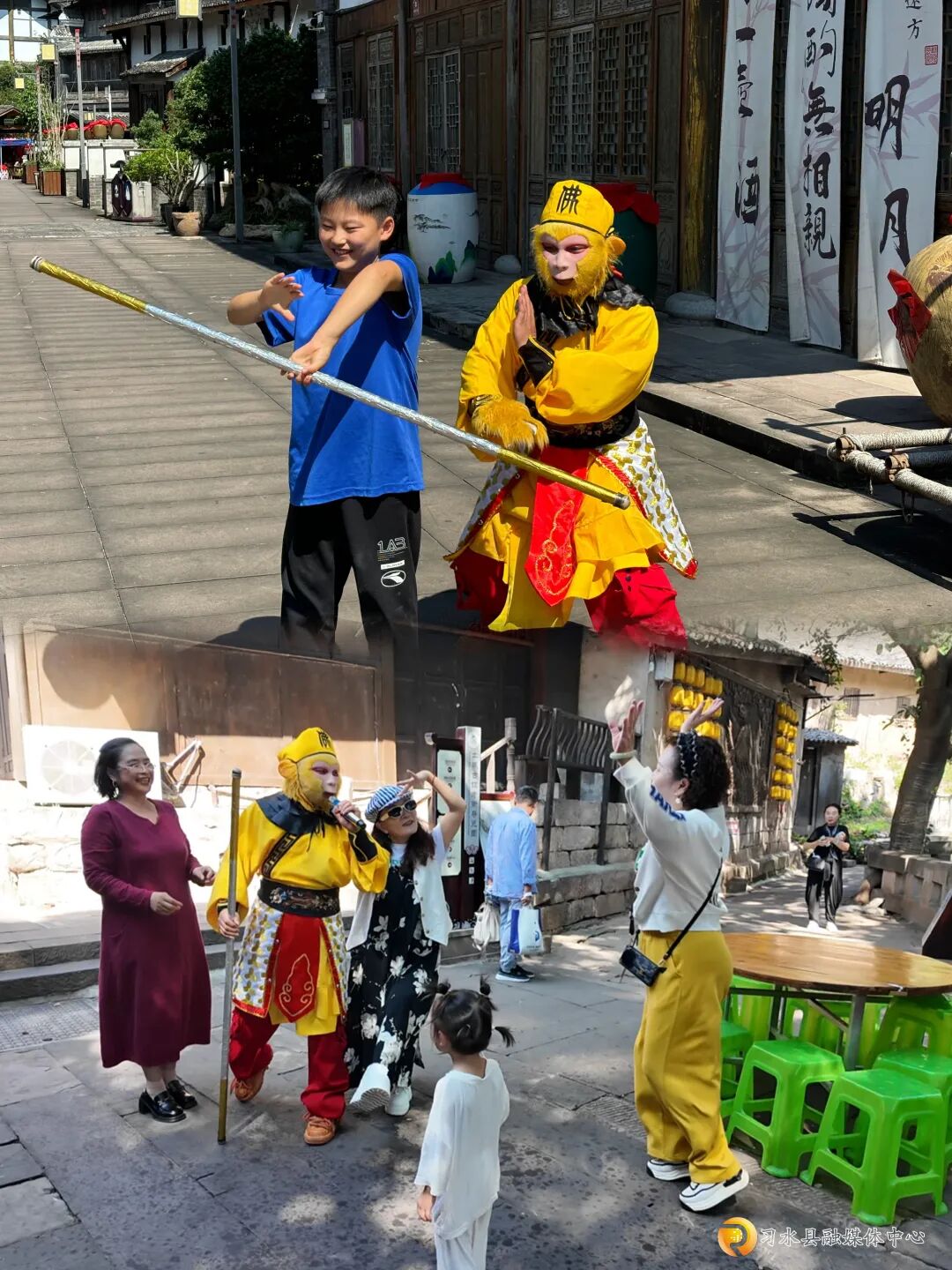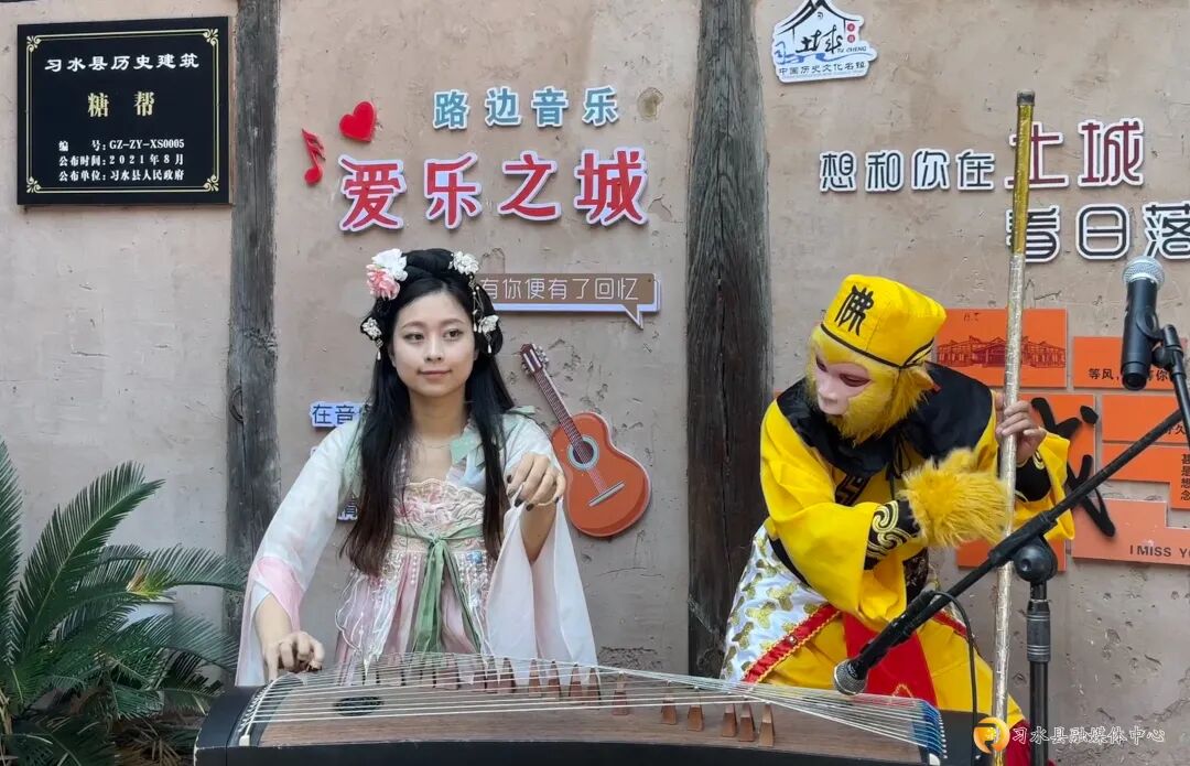 旁边的“路边音乐•爱乐之城”打卡点更具“穿越感”:身着古装的姑娘指尖划过古筝弦,弹出流水般的旋律;扮成“美猴王”的演员扛着金箍棒,时不时和路过的孩子互动——10岁的小游客壮壮抢过道具棒,学着孙悟空耍棍的架势摆pose,妈妈在一旁笑出了声:“孩子平时就爱《西游记》,看到‘美猴王’非要合影,古镇这互动太对小朋友胃口了!”