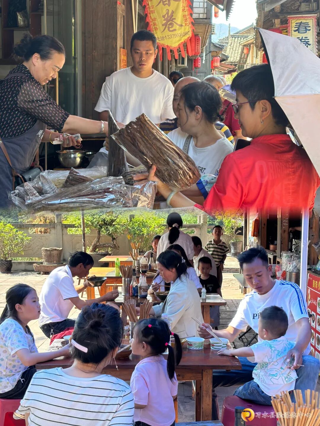 古街上的市集更是“人挤人”的热闹。卖春卷的铺子前,老板麻利地往薄饼里裹上萝卜丝、折耳根;古镇商铺的摊位上,捆成束的干货堆得像小山,老板娘一边给游客装袋,一边笑着吆喝:“本地晒的笋干,炖肉香得很!”