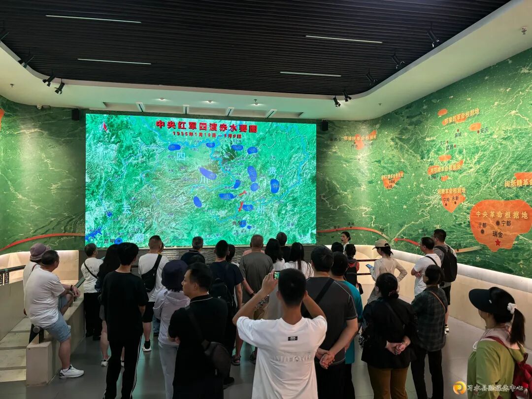 四渡赤水纪念馆内,人气同样高涨。巨大的屏幕上,“中央红军四渡赤水要图”清晰铺展,讲解员的声音透过扩音器传来,游客们或仰头专注聆听,或拿出手机拍摄画面。