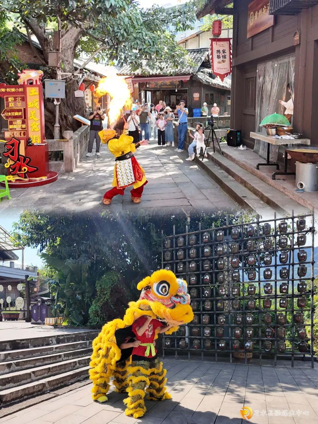古镇主街道人头攒动,热闹非凡。伴随着铿锵有力的锣鼓声,两只威风凛凛的“雄狮”登场,时而跳跃腾挪,时而摇头摆尾,动作灵活传神,引得观众阵阵欢呼。表演者还走下舞台与游客互动,邀请孩子们抚摸狮头、体验舞狮乐趣,将节日的欢乐传递给每一个人。