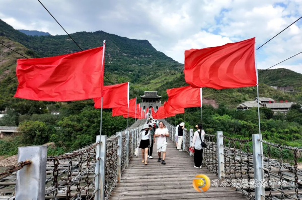 铁索桥上一排排整齐悬挂的红旗迎风招展。