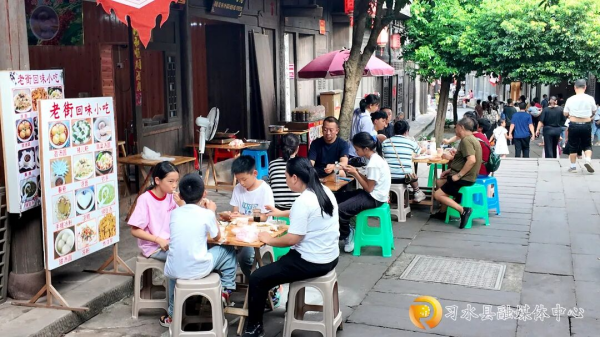老街回味小吃店坐满游客,品尝土城特色小吃。