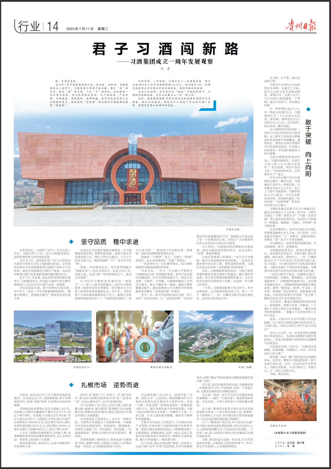 “当前习酒生产稳定、质量稳步提升、内部管理进一步强化,整体稳定,未来发展基础厚实。”习酒集团党委副书记,总经理汪地强也表示,习酒集团将保持谨慎乐观的态度,围绕“挺君品、稳88、扩金钻、扶直营、育电商”的总体要求,既抓基础又抓发展,以系统性思维打好营销“组合拳”,确保完成2023年全年销售目标。
