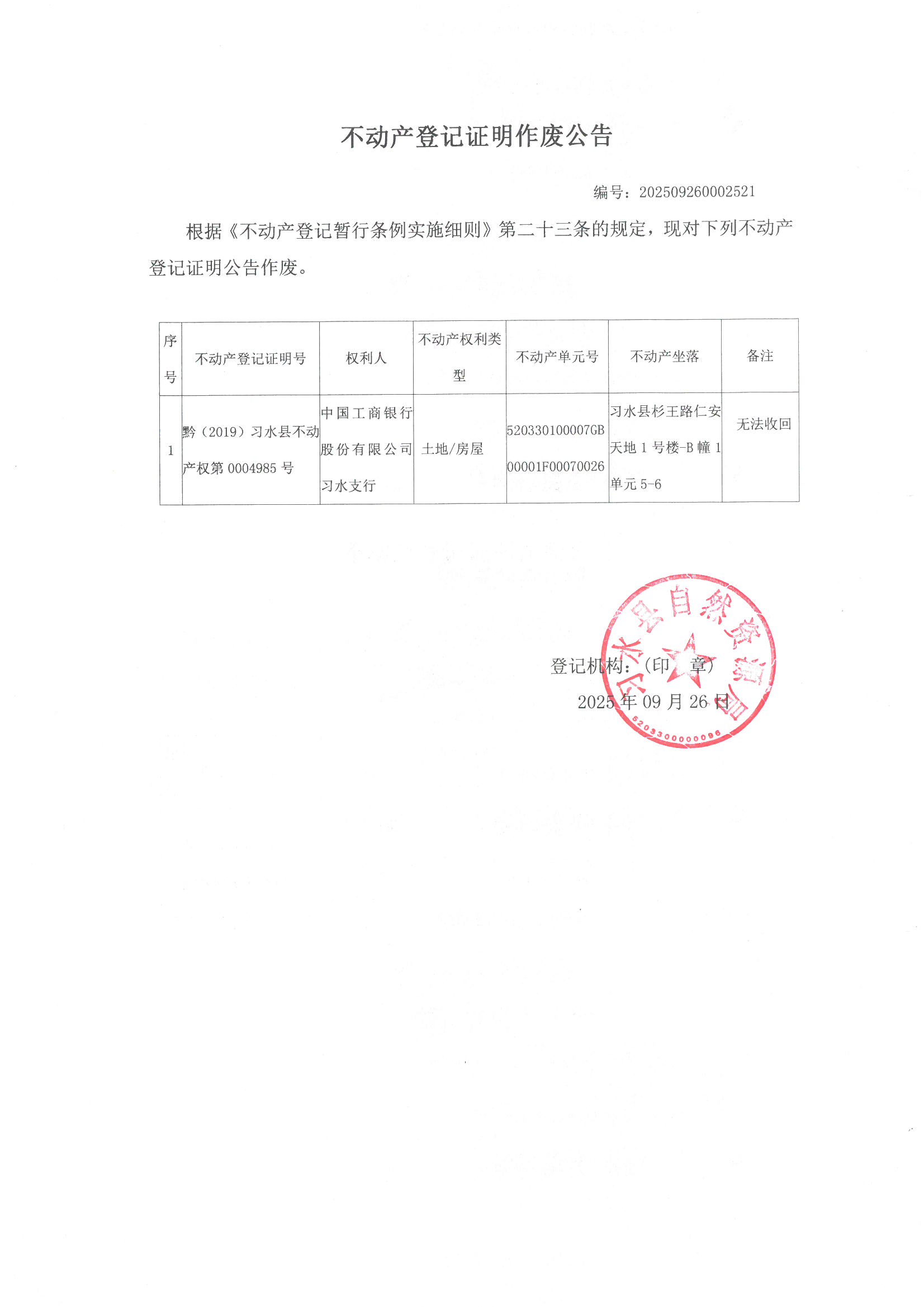 不动产登记证明作废公告(中国工商银行股份有限公司习水支行)