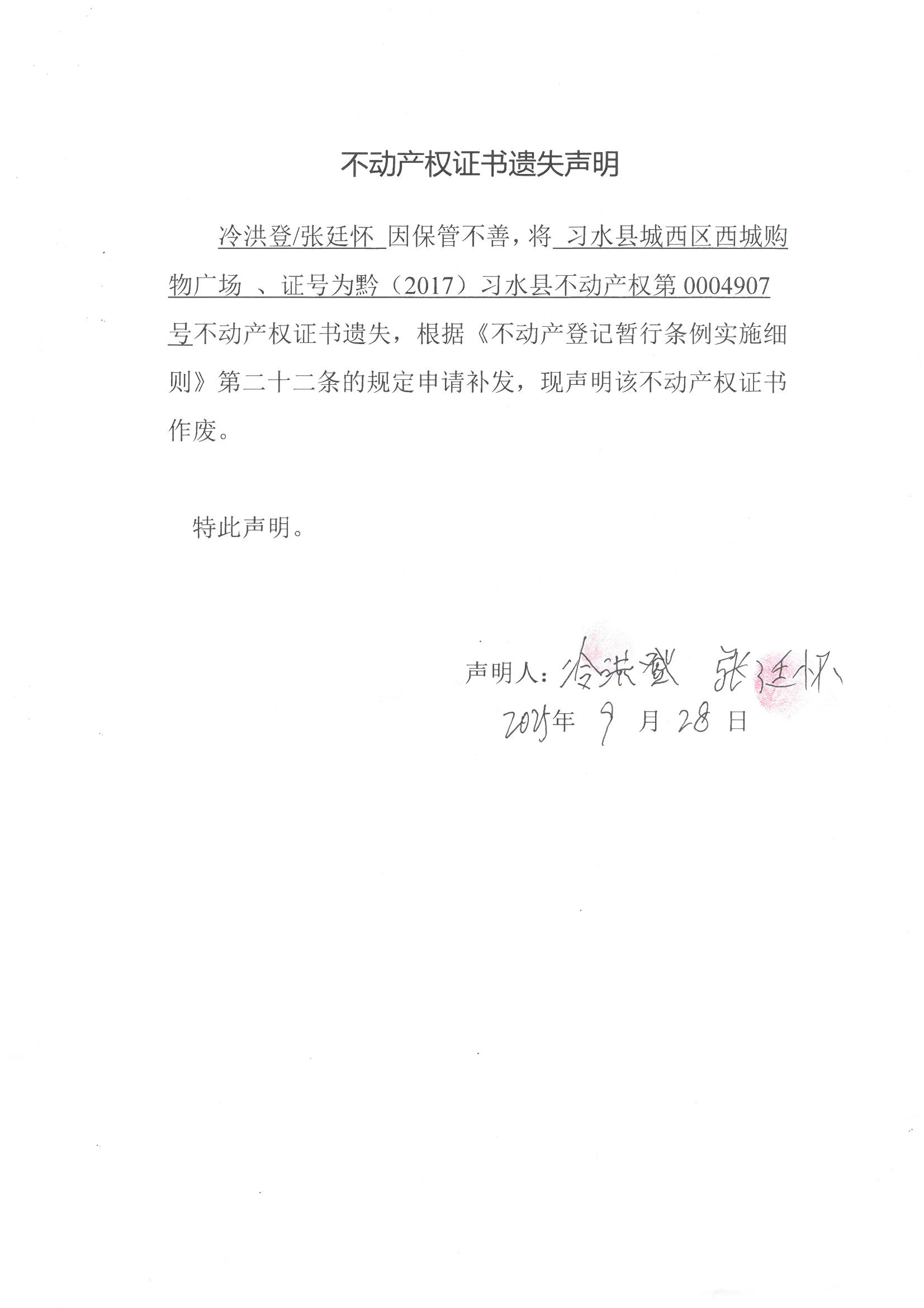 不动产权证书遗失声明(冷洪登、张廷怀)