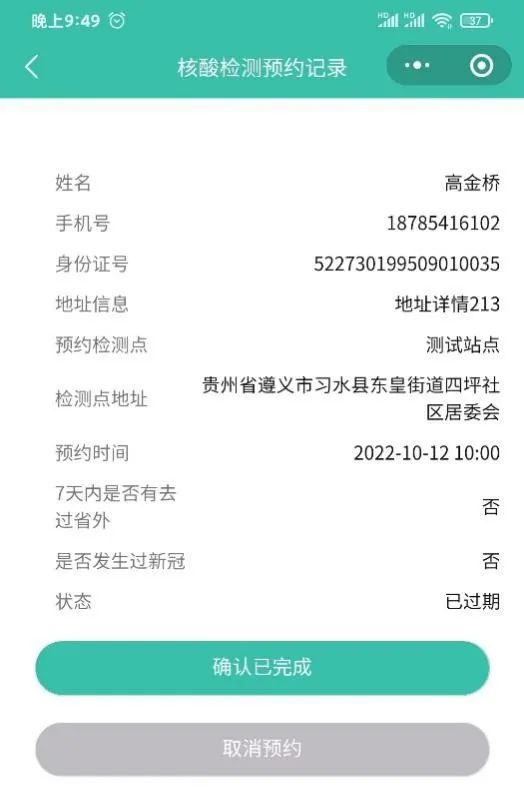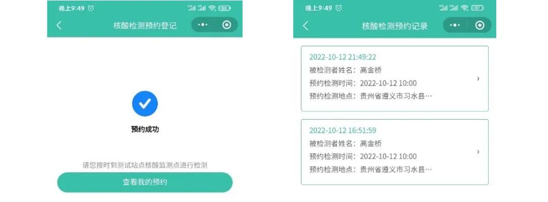 第五步:预约成功后,可在“我的”查看本人或为他人预约的核酸检测记录: