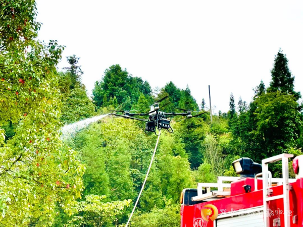 无人机组化身“空中战士”,携带灭火弹和水灭火装备,对人员难达区域展开“空袭”。