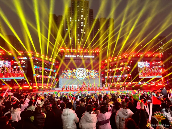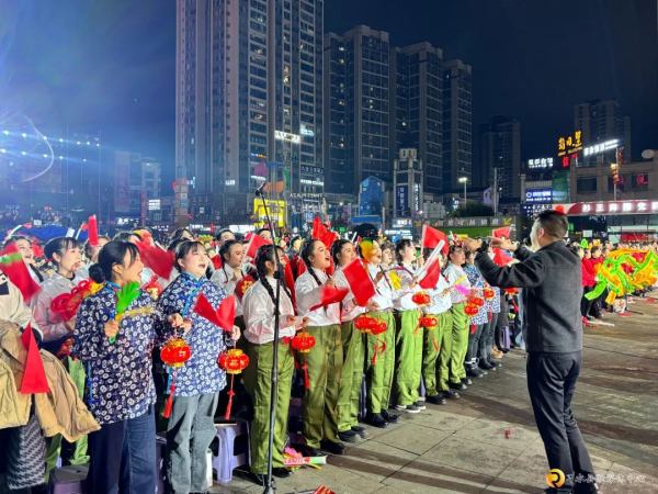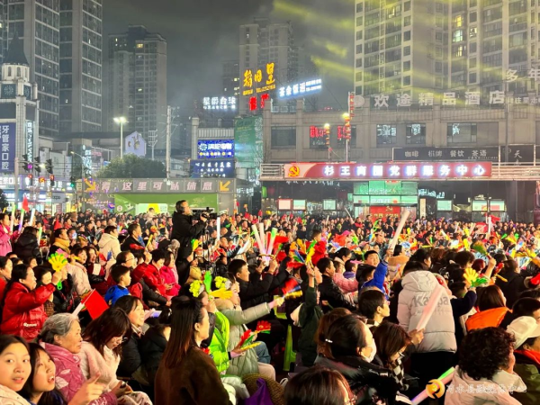 夜幕降临,华灯璀璨。广场中心人潮涌动,欢声笑语,处处洋溢着喜庆祥和的节日氛围。