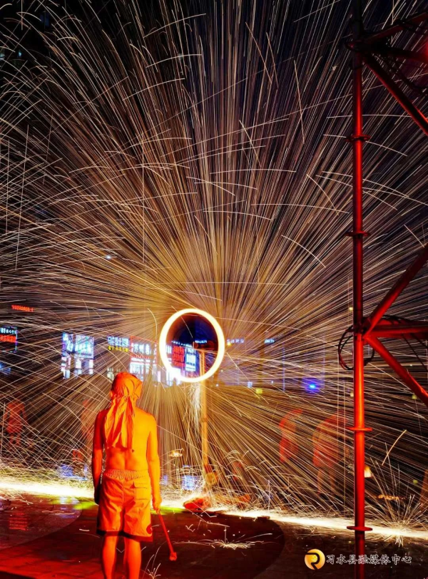 随后,非遗“打铁花”表演震撼登场。表演者将高温熔化的铁水用力击打,铁水瞬间纷飞,绽放成漫天金花,如璀璨流星划过,又似烟火般绚丽夺目,照亮了习水的夜空。现场观众被这壮观的景象所震撼,纷纷拿出手机记录这一惊艳时刻,感受着传统文化的独特魅力。