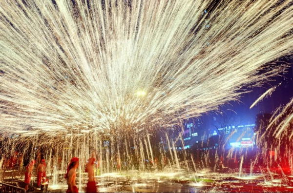▲精彩绝伦的非遗“打铁花”表演  曹梅梅摄