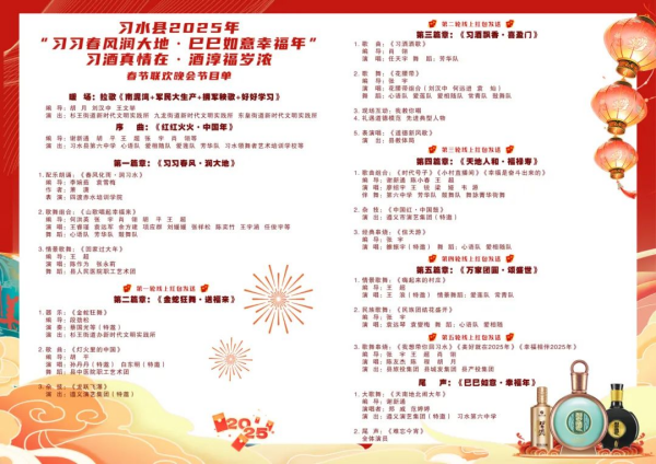 整场演出分为《习习春风·润大地》《金蛇狂舞·送福来》《习酒飘香·喜盈门》《天地人和·福禄寿》《万家团圆·颂盛世》五个篇章,通过歌舞、情景剧、配乐朗诵等多种艺术形式,展现了习水人民的幸福生活、昂扬向上的精神风貌和对美好未来的无限憧憬。
