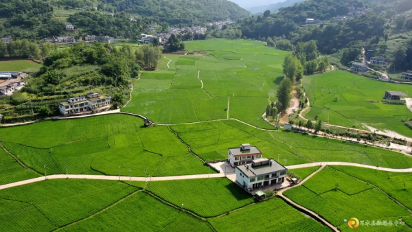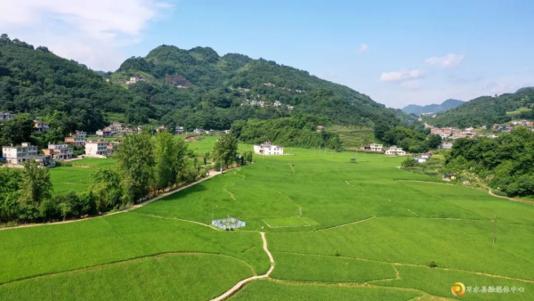 500亩稻田绿意盎然,绿浪翻涌,映衬着青翠远山。登上“风雨亭”,坝区全景尽收眼底,依依垂柳如绿丝带在空中翩翩起舞,盛夏时节,随风轻摆的柳叶遮挡了炎炎烈日,为人们营造出一片清凉;河水边悠然自得的垂钓人,广场上姿态优雅的跳舞者,追逐嬉戏的小孩,乘凉唠家常的老人,好一幅美丽幸福的田园乡村图景。