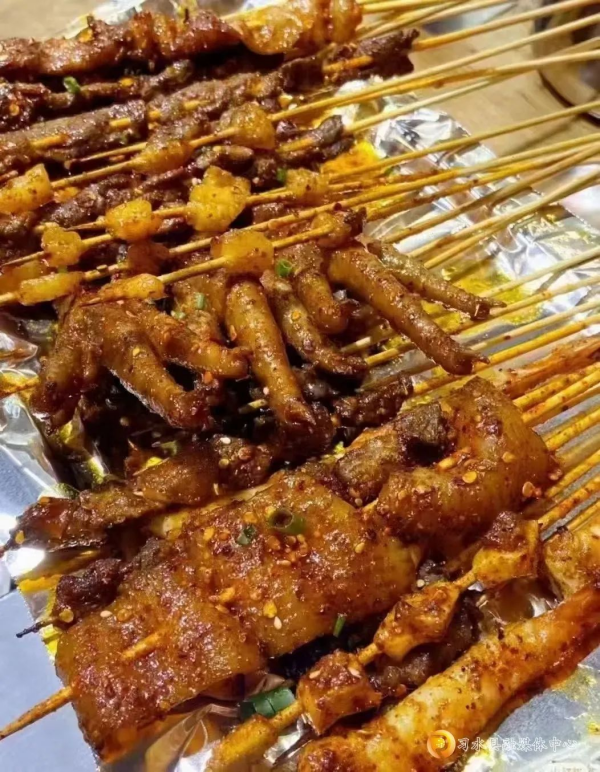 温水烧烤最大的特点就是鲜、香、辣的味道都能很好地保留,口感十分丰富。“不卖隔夜菜”烧烤店作为温水本地人开了20多年的老字号,人气火爆。热气腾腾的烧烤架上,“万物皆可烤”。海鲜类炭烤生蚝、鲜虾,无肉不欢的各式肉串,荤素搭配的粉丝茄子……伴随着滋滋的油爆声,食物的香气扑鼻而入。宽敞整洁的大厅内,三五好友同坐,大口吃肉,尽享烟火人间的畅快,更是平凡生活里的热辣慰藉。这时候,冰啤酒,冰西瓜,冰粉,也必不可少,唯美食与爱不可辜负。