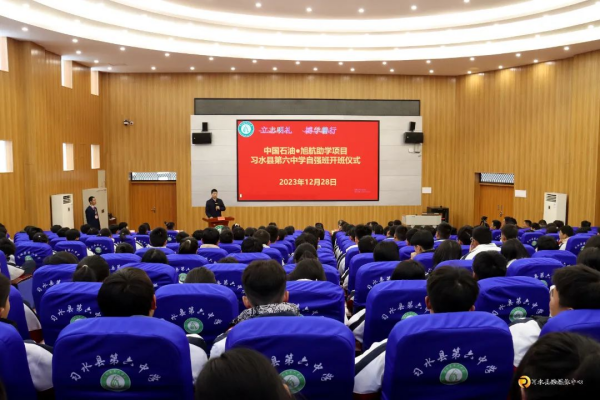 2023年12月28日,中国石油·旭航助学项目开班仪式在习水县第六中学举行。县委常委、副县长杨帆出席并讲话,利雅得能源公司董事长朱增武,昆仑信托有限责任公司副总裁、董事会秘书矫德峰等企业相关部门负责人出席开班仪式。