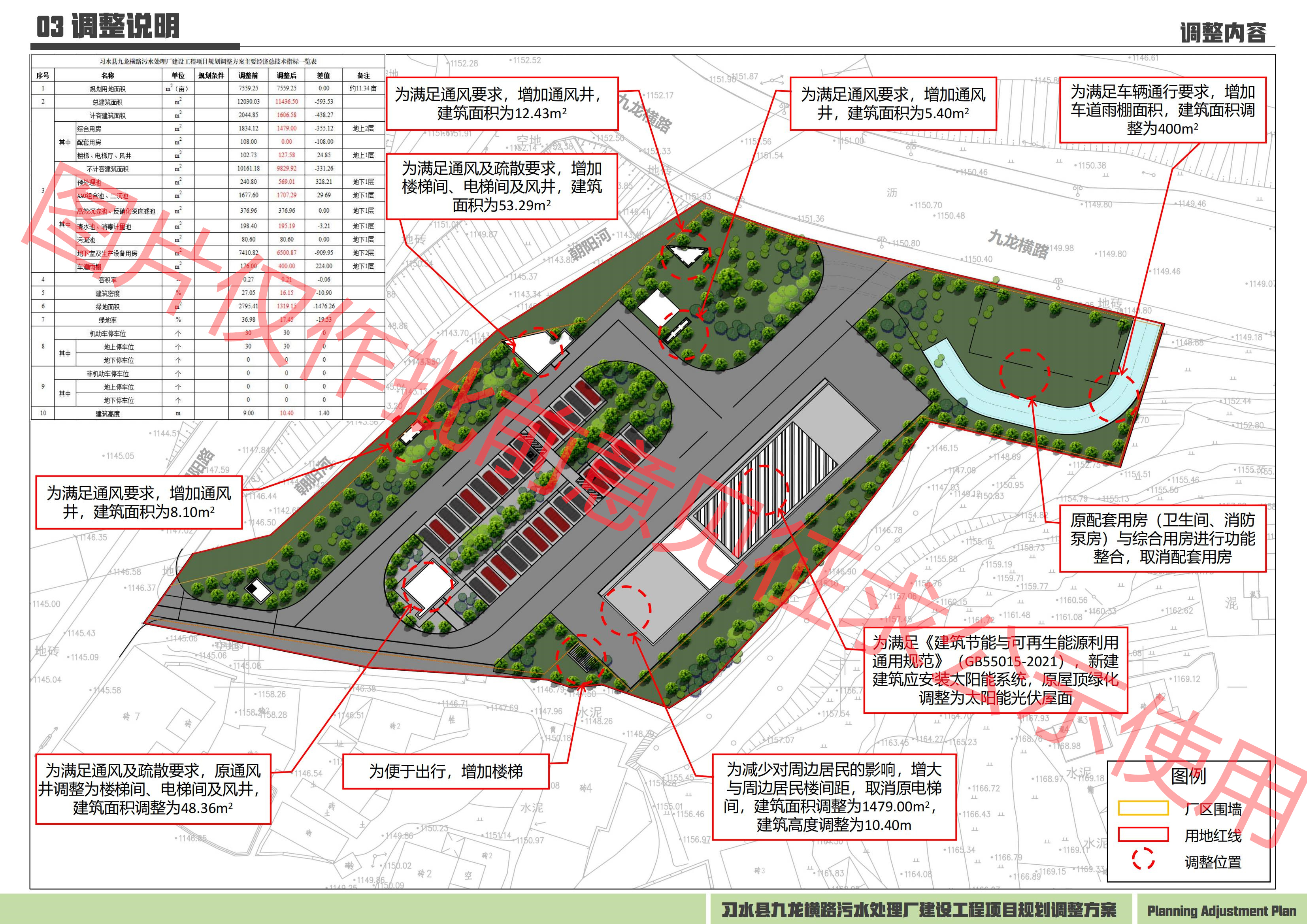 习水县九龙横路污水处理厂项目位于习水县九龙街道九龙横路与朝阳路交汇处,规划总用地面积7559.25㎡(合11.34亩)。项目规划方案已于2023年7月12日批复同意。建设单位结合用地实际以及工艺要求申请规划调整。调整内容:一、取消综合用房一层楼梯、电梯间,屋顶绿化调整为太阳能光伏屋面;二、取消配套用房,将卫生间、消防泵房与综合用房整合,原位置调整为绿化;三、增加2座楼梯、电梯厅;四、部分风井位置进行调整。规划调整方案已报县规委会办公室技术审查。