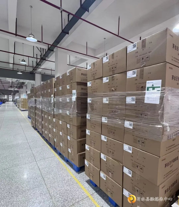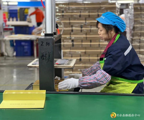 在习水县二郎俊丰产业园内,俊丰供应链管理有限公司的生产车间里机器轰鸣,机械化生产线高速运转,工人们在各自岗位上熟练操作,不多时,一件件精美的酒盒成品便完成了。