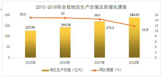 2018年,在全省增比进位综合测评考核中,我县排全省县域第一方阵第4位。初步核算,全县地区生产总值189.07亿元,比上年增长11.9%。按产业分,第一产业增加值31.98亿元,增长6.8%;第二产业增加值92.15亿元,增长15.3%(工业增加值68.09亿元,增长16.8%);第三产业增加值64.95亿元,增长10%。一、二、三产业增加值占地区生产总值的比重分别为16.91%、48.74%、34.35%。人均地区生产总值达到36235元,比上年增加3425元,比上年增长10.4%。