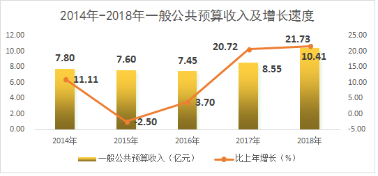2018年,全县完成财政总收入34.3亿元,比上年增长34.13%。其中:国税收入完成23.2亿元,增长33.56%;地税收入完成9.5亿元,增长43.91%;财政收入完成1.6亿元,增长-0.11%。一般公共财政预算收入达到10.4亿元,比上年增长21.73%。全县公共财政预算支出49.63亿元,比上年增长5.78%;一般公务支出(8类)32.98亿元,比上年增长3.83%,其中:一般公共服务支出为3.91亿元,增长-12.99%;教育支出为1.25亿元,增长-7.04%;科学技术支出为11.14亿元,增长4.71%;社会保障和就业支出为1.09亿元,同比增长14.25%;公共安全支出为6.41亿元,增长31.34%;医疗卫生与计划生育支出为6.67亿元,增长11.98%;节能环保支出为1.9亿元,增长23.33%;城乡社区事务支出为0.61亿元,增长-68.89%。