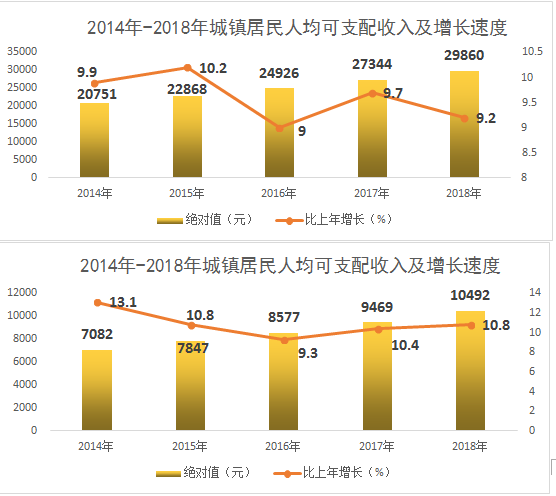 城乡居民生活水平不断提高。城镇常住居民人均可支配收入为29860元,同比增长9.2%;农村常住居民人均可支配收入达到10492元,同比增长10.8%。